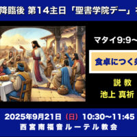 聖霊降臨後 第15主日「聖書学院デー」礼拝 午前10:30~11:45 説教はマタイ9章9~13節から「食卓につく条件」池上 真祈師 世間的に問題のある人と見なされていた人たちがやってきて、イエスと食卓を共にしていました …