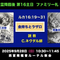 聖霊降臨後 第16主日 ファミリー礼拝 午前10時30分〜11時45分 説教はルカ16章19〜31節から「金持ちとラザロ」ネヴダル・クリストファー宣教師 幸せとは何か? どうあることなのか? 見かけだけで判断出来るのか …