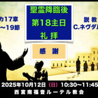 聖霊降臨後 第18主日 礼拝 午前10時30分〜11時45分 説教はルカ17章11〜19節から「感 謝」C.ネヴダル宣教師 私たちは病であれ困難な問題であれ、さまざまな課題を背負って生きています。疲れてしまい、時には人 …